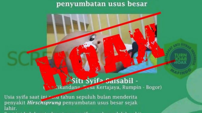 Dengan demikian flyer penggalangan donasi untuk Siti Syifa Salsabil yang menderita penyumbatan usus besar adalah hoaks dan masuk kategori konten palsu.