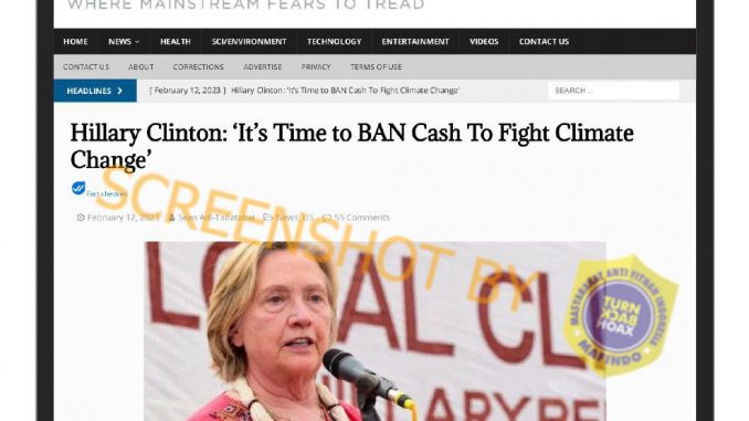 Portal berita News Punch menulis berita mengenai Hillary Clinton yang mengimbau pelarangan uang tunai sebagai upaya untuk melawan perubahan iklim. Dilansir dari berita tersebut, Hillary Clinton berkata demikian pada pidatonya di Gujarat, India, pada 9 Februari 2023.