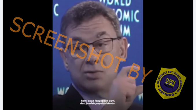 Video beredar di Facebook yang menampilkan CEO Pfizer sedang berbicara pada acara World Economic Forum, dalam potongan tersebut CEO Pfizer menyebut akan mengurangi penduduk di dunia hingga 50%.