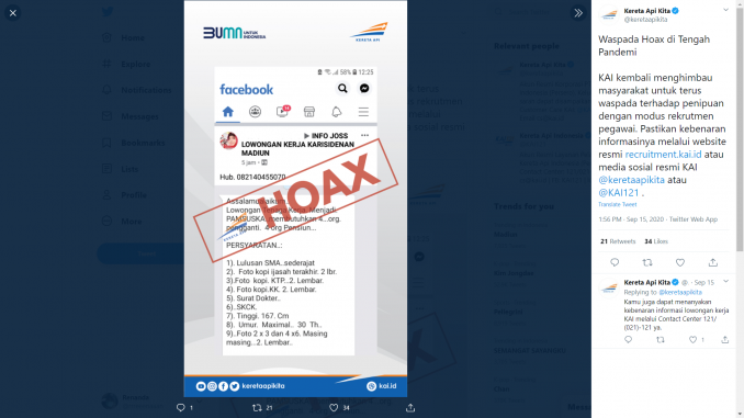 Dengan demikian, informasi yang disebarluaskan oleh @arwidodo adalah hoaks lama yang muncul kembali dan merupakan konten yang dimanipulasi.