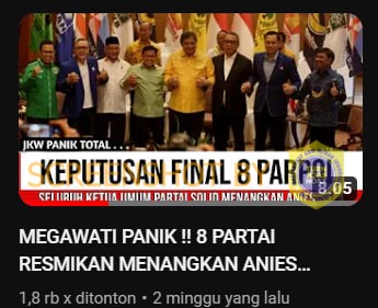 Kanal Youtube Suara Rakyat memposting video berdurasi 8 menit 4 detik berjudul “MEGAWATI PANIK !! 8 PARTAI RESMIKAN MENANGKAN ANIES 2024….”. Thumbnail video tersebut memperlihatkan 8 orang pimpinan partai yang saling berpegangan tanggan. Video tersebut diunggah pada 31 Juli 2023 sudah ditonton 1.884 kali.