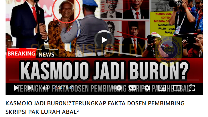 Sebuah kanal Youtube bernama ARENA POLITIK mengunggah video berjudul “KASMOJO JADI BUR0N:interrobang:TERUNGKAP FAKTA DOSEN PEMBIMBING SKRIPSI PAK LURAH ABAL²”. Pada bagian thumbnail video tersebut memperlihatkan sosok yang diklaim sebagai dosen pembimbing Jokowi di UGM sedang di hadapan polisi.