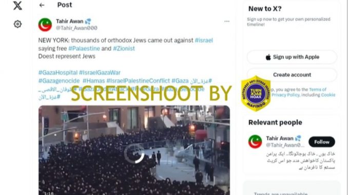 Akun Twitter @Tahir_Awan000 mengunggah video yang menunjukkan ribuan orang berpakaian serba hitam berdemo di tengah jalan. @Tahir_Awan000 menklaim bahwa video tersebut adalah ribuan warga Yahudi Ortodoks AS yang protes untuk membela Palestina dan menentang Israel. Cuitan dan video yang diunggah pada 20 Oktober 2023 tersebut telah disukai 215 orang, dikutip dan dibagikan ulang hampir 200 kali, serta telah dilihat lebih dari 21,500 kali.