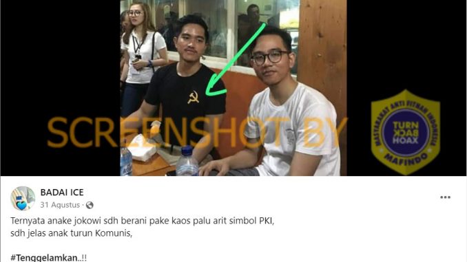 Akun Facebook BADAI ICE memposting sebuah gambar Kaesang dan Gibran yang tengah duduk berdua. Nampak Kaesang memakai baju hitam dengan logo palu arit. Terdapat caption dengan klaim kaos palu arit adalah simbol PKI. Postingan tersebut diunggah pada 31 Agustus 2023.