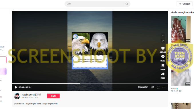 Sebuah akun TikTok mengunggah foto burung elang tampak dari samping dan tampak dari depan. Foto tersebut menunjukkan adanya perbedaan yang cukup jauh jika elang difoto dari depan. Foto di sebelah kiri menampilkan elang dari posisi yang terlihat paruhnya yang tajam. Sedangkan foto sebelah kanan menampilkan elang dari posisi depan yang muka elang menyerupai seperti manusia. Faktanya, sudah dipastikan jika foto tersebut hasil manipulasi.