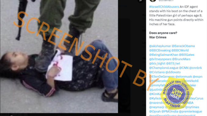 Sebuah foto menunjukkan prajurit dengan seragam militer menginjak seorang anak perempuan dan menodongkan senapan panjang ke kepala anak tersebut. Prajurit tersebut diklaim merupakan tentara Israel yang sedang menyerang anak kecil dari Palestina.