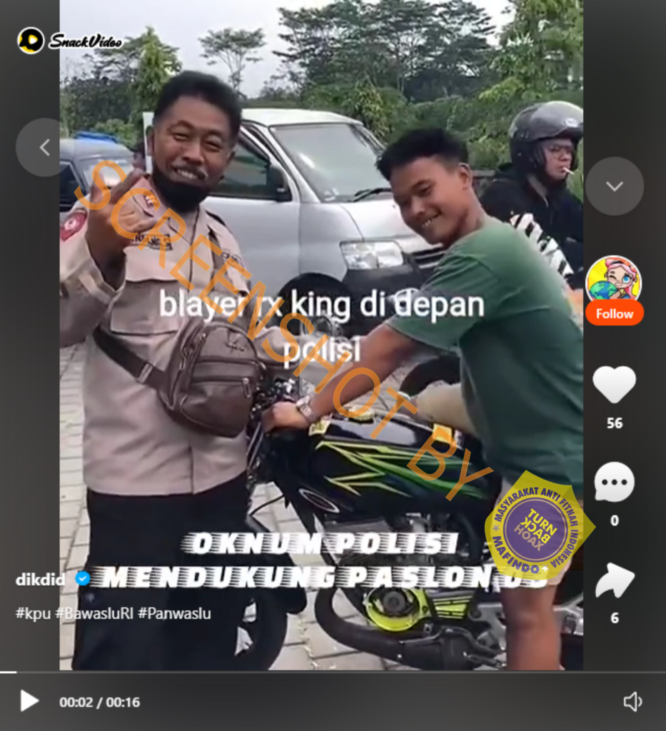 Sebuah postingan video di SnackVideo.com menunjukkan seorang polisi mengacungkan salam tiga jari di samping seseorang yang menggeber motor RX King. Polisi tersebut diklaim seorang oknum yang mendukung pasangan Calon Presiden nomor urut 3, yakni Ganjar – Mahfud.