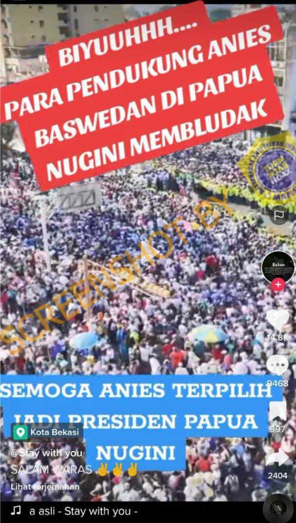 Akun Tiktok @stayw1thyo https://vt.tiktok.com/ZSF1SvdET/ / https://ghostarchive.org/archive/dzuoK (arsip) mengunggah sebuah video yang menampilkan lautan manusia dengan klaim merupakan massa pendukung Anies Baswedan di Papua Nugini.