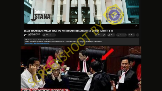 Kanal Youtube CATATAN ISTANA mengunggah video dengan klaim sidang MK berlangsung panas, Ketua KPU tidak berkutik pada saat dicecar oleh hakim MK dan kuasa hukum paslon nomor satu (Anies-Muhaimin) dan paslon nomor tiga (Ganjar-Mahfud).