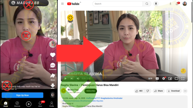 SUMBER membagikan video hasil MANIPULASI yang menyebabkan kesimpulan yang SALAH, BUKAN tentang situs judi. Selain terlihat kekurangan (artifact/distortion) di bagian mulut dan suara DISUNTING menggunakan kecerdasan buatan (AI, Artificial Intelligence), di video yang ASLI sebenarnya yang dibicarakan adalah tentang perempuan yang harus bisa mandiri.