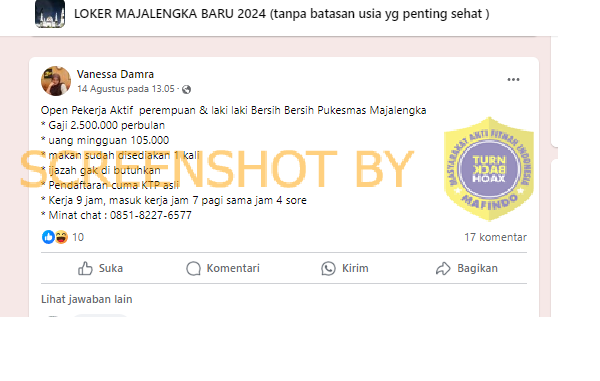 Beredar informasi lowongan kerja mencatut nama Puskesmas Majalengka. Informasi tersebut diunggah oleh akun Vanessa Damra, di sebuah grup Facebook LOKER MAJALENGKA BARU 2024 pada 14 Agustus 2024.