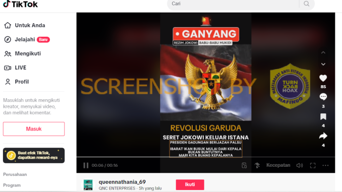 Akun TikTok @queennathania_69 mengunggah video yang menampilkan lambang negara Indonesia, Garuda beserta narasi yang menyebut jika Jokowi merupakan presiden gadungan berijazah palsu.