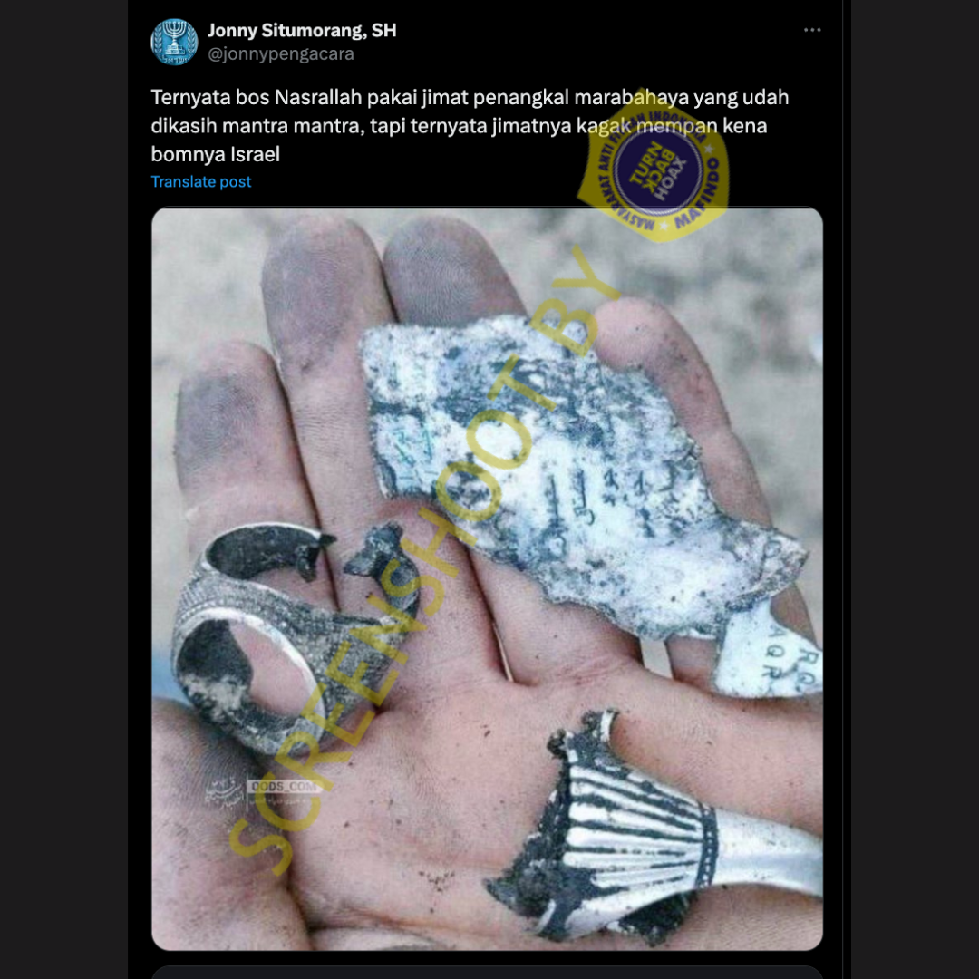 Akun Twitter/X @jonnypengacara mengunggah cuitan yang melampirkan foto yang diklaim sebagai jimat yang digunakan oleh Hassan Nasrallah. Jimat ini disebut sebagai penangkal bahaya, namun tidak mempan untuk menangkal bom Israel.
