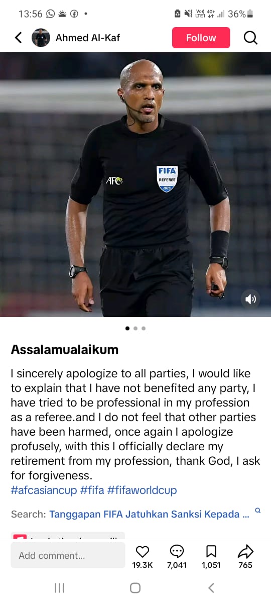 I sincerely apologize to all parties, I would like to explain that I have not benefited any party, I have tried to be professional in my profession as a referee.and I do not feel that other parties have been harmed, once again I apologize profusely, with this I officially declare my retirement from my profession, thank God, I ask for forgiveness.