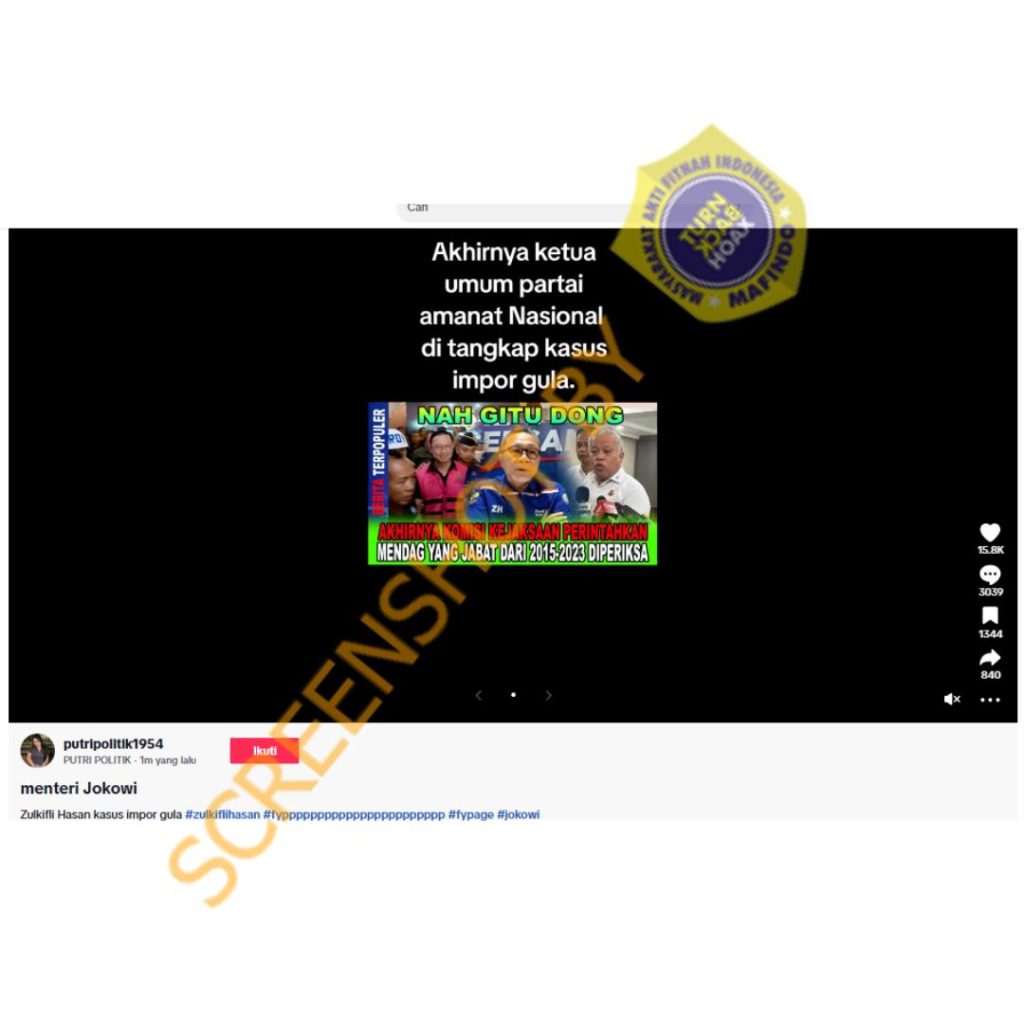 Akun TikTok “putripolitik1954” pada Jumat (15/11/2024) mengunggah foto [arsip] berisi informasi mengenai penangkapan Menteri Koordinator (Menko) Bidang Pangan Zulkifli Hasan (Zulhas).