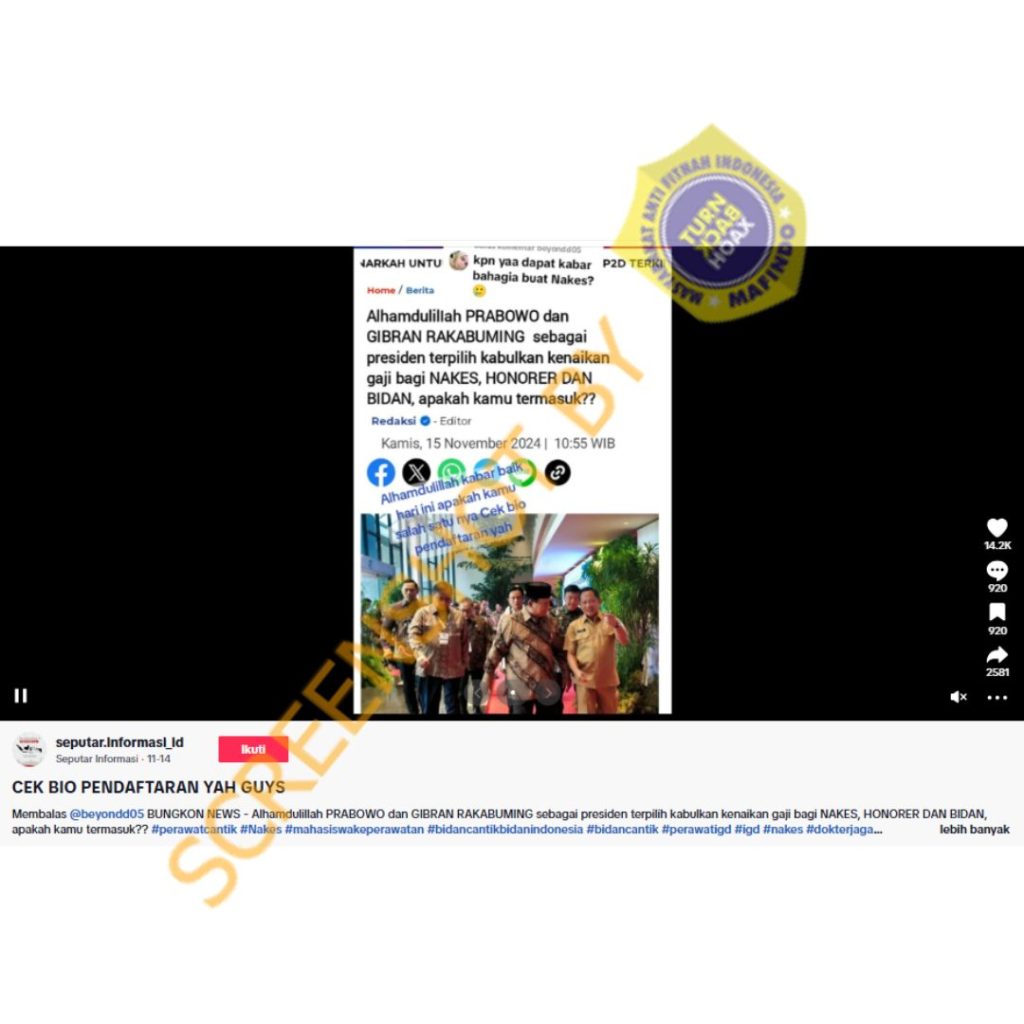 Akun TikTok “seputar.informasi_id” pada Kamis (14/11/2024) mengunggah foto [arsip] berisi potret Presiden Prabowo disertai klaim “Prabowo kabulkan kenaikan gaji tenaga kesehatan dan guru honorer.”