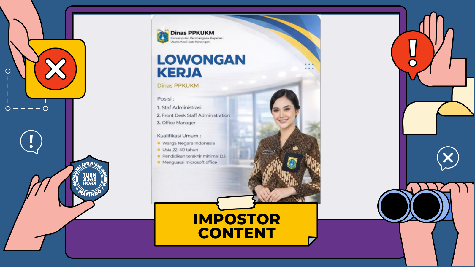 Unggahan berisi informasi “rekrutmen PLN lewat email rekrutmen@pln123.info” merupakan konten tiruan (impostor content) untuk modus penipuan.