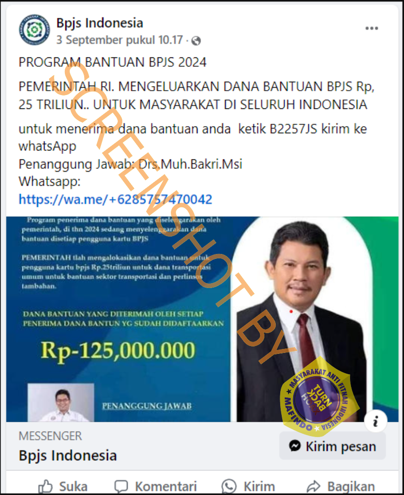 Dalam narasi unggahan tersebut, disebutkan bahwa masyarakat yang memiliki satu anak akan mendapatkan bantuan sebesar 10 juta rupiah, dua anak sebesar 15 juta rupiah, hingga bantuan khusus bagi remaja, pemuda, dan lansia. Unggahan ini mencantumkan nomor WhatsApp sebagai kontak untuk mengakses bantuan. Berikut isi narasi lengkapnya: