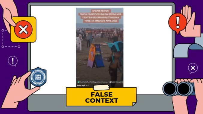 Sebuah video [arsip] yang diunggah oleh akun TikTok “alongsigli” pada Minggu (6/4/2025), menunjukkan suasana pantai yang ramai dikunjungi oleh masyarakat diduga mengalami kenaikan gelombang tinggi hingga 10 meter. Dalam unggahannya, lokasi tersebut berada di pantai Pasir Putih Kangean, Sumenep, Jawa Timur.