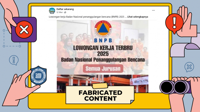 Unggahan berisi tautan “pendaftaran lowongan pekerjaan BNPB” merupakan konten palsu (fabricated content).