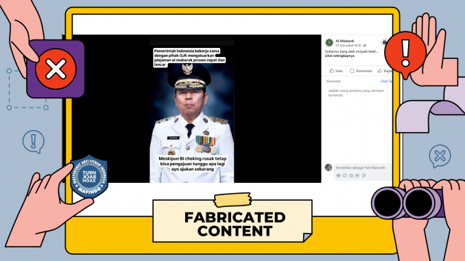 Akun Facebook “Al-Mubarok” pada Senin (23/06/2025) mengunggah video pendek [arsip] yang menampilkan Gubernur Jawa Barat Dedi Mulyadi mempromosikan Pinjol.