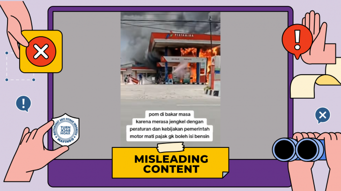 Unggahan berisi klaim “massa bakar pom bensin karena kebijakan pemerintah motor mati pajak tidak boleh isi bensin” merupakan konten yang menyesatkan (misleading content).