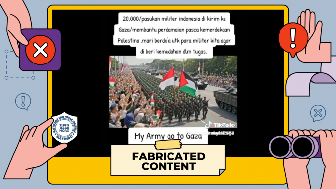 Unggahan berisi klaim “Indonesia kirim 20 ribu pasukan ke Gaza membantu perdamaian pasca kemerdekaan Palestina” merupakan konten palsu (fabricated content).