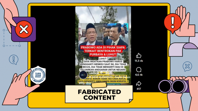 Unggahan berisi klaim “Luhut ingatkan Prabowo untuk ganti Menkeu Purbaya” merupakan konten palsu (fabricated content).