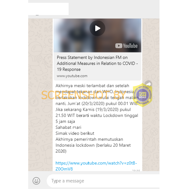 Sebuah narasi beredar melalui pesan berantai Whatsapp dan juga media sosial Facebook. Dalam narasi yang beredar, disebutkan bahwa pemerintah akan segera berlakukan lockdown untuk Indonesia pada Jumat, 20 Maret 2020. Dalam narasi yang beredar, turut disematkan sebuah link yang menunjukkan video konferensi pers Menteri Luar Negeri RI, Retno Marsudi. Jika melihat dari video yang disertakan, maka narasi yang menyatakan bahwa Indonesia akan lockdown terhitung pada 20 Maret 2020 adalah tidak sesuai dengan fakta.