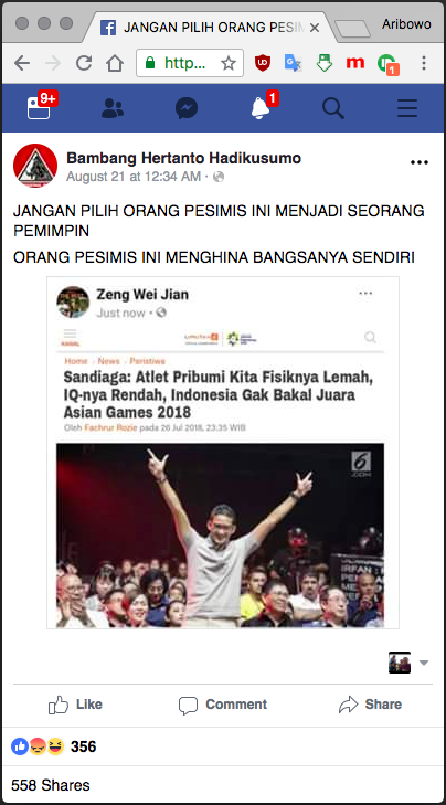 [DISINFORMASI] Gambar hasil suntingan di berita "Sandiaga Tak Yakin Indonesia Raih Juara di Asian Games 2018"