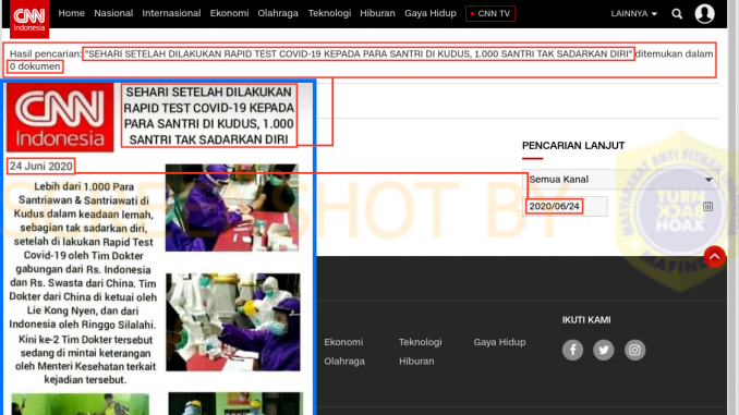 Hasil pencarian di situs CNN Indonesia dengan kata kunci “SEHARI SETELAH DILAKUKAN RAPID TEST COVID-19 KEPADA PARA SANTRI DI KUDUS, 1.000 SANTRI TAK SADARKAN DIRI” untuk artikel pada 24 Jun 2020, hasil pencarian: TIDAK ditemukan artikel.