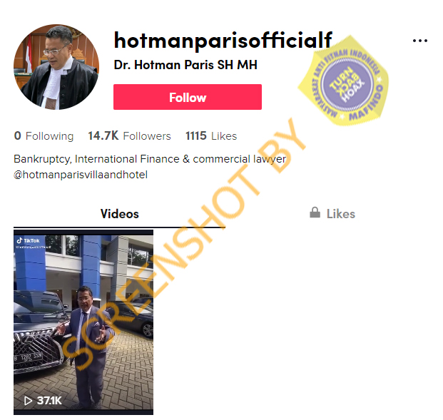 Beredar akun Tiktok dengan nama @hotmanparisofficialf. Dalam profilnya tertera profesi sebagai pengacara kelas internasional.
