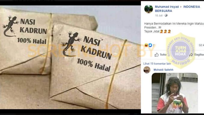 Akun facebook bernama Muhamad Irsyad mengunggah foto nasi bungkus yang terdapat gambar kadal dan tulisan nasi kadrun 100% halal. selain itu akun tersebut juga menambahkan narasi “Hanya Bermodalkan Ini Mereka Ingin Mahzulkan Presiden…!!!