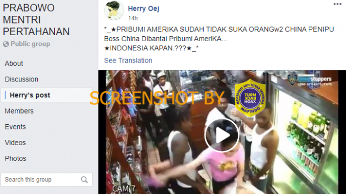 Melalui media sosial Facebook, akun @HerryOej membagikan video yang memperlihatkan pemukulan oleh sekelompok orang di dalam sebuah toko. Unggahan @HerryOej dibarengi dengan keterangan “Boss China Dibantai Pribumi AmeriKA. INDONESIA KAPAN?”, dan dibagikan sebanyak enam kali oleh pengguna Facebook lainnya.