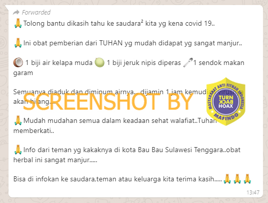 Beredar pesan berantai Whatsapp yang berisikan informasi mengenai obat untuk Covid-19. Dalam pesan berantai tersebut dikatakan bahwa obat Covid-19 terdiri dari campuran air kelapa muda, jeruk nipis, dan sesendok makan garam yang diaduk kemudian diminum airnya.