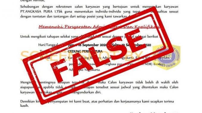 Informasi palsu. PT Angkasa Pura I melalui akun Twitter Contact Center Bandara 172 @angkasapura172 menegaskan surat informasi panggilan kerja tersebut adalah palsu alias hoaks.