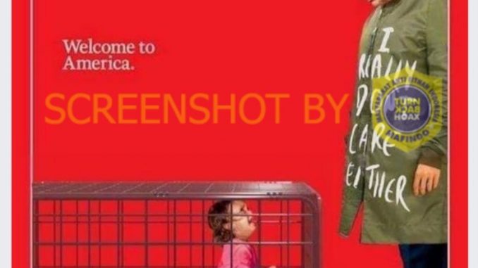 Akun Facebook Close the Camps mengunggah foto sampul majalah TIME (21/9) yang menunjukkan Trump, mengenakan jaket bertuliskan “I Really Don’t Care Either”, atau dapat diartikan sebagai “Aku Juga Sangat Tidak Peduli”, memandang ke arah seorang anak perempuan yang tengah menangis di dalam kurungan.