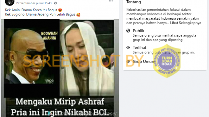 Akun Facebook bernama Vian Riadi mengunggah stastus pada tanggal 27/9/2020 di grup Facebook ‘TETAP JOKOWI’ berupa kolase foto pria dan aktris Bunga Citra Lestari (BCL) dengan narasi “Mengaku Mirip Ashraf Pria ini Ingin Nikahi BCL”.