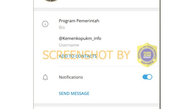 Hasil periksa fakta Rahma An Nisa (Uin Sunan Ampel Surabaya). Akun Telegram dengan username “Kemenkopukm_info” bukanlah milik Kementerian Koperasi dan Usaha Kecil dan Menengah (Kemenkop UKM). Informasi tersebut tidak benar. Dalam akun Instagram resmi @kemenkopukm mengonfirmasi bahwa akun Telegram dengan username “@Kemenkopukm_info” palsu atau hoax.
