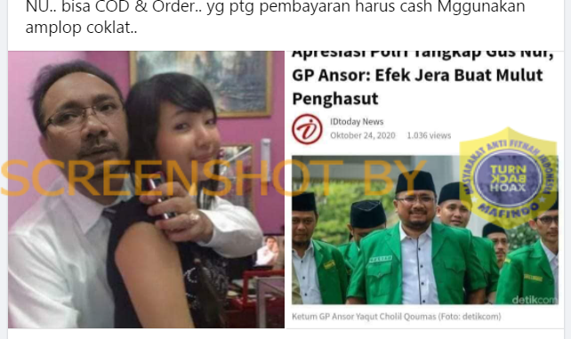 Akun Facebook Mulyono Ali membagikan foto pada grup KERAH BATIK (kendal bergairah debat politik). Dalam foto unggahan yang dibagikan tanggal 30 Oktober 2020 itu terdapat wajah dari tokoh GP Ansor bernama Yaqut Cholil Qoumas.
