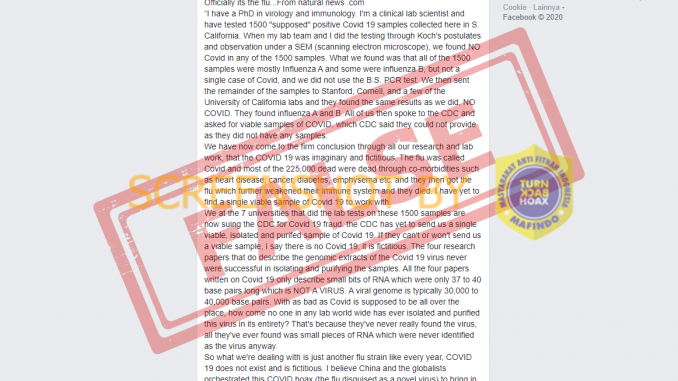 “Kami sekarang telah sampai pada kesimpulan tegas melalui semua penelitian dan pekerjaan lab kami, bahwa COVID 19 adalah khayalan dan fiktif. Kami di 7 universitas yang melakukan tes lab pada 1500 sampel ini sekarang menggugat CDC untuk penipuan Covid 19. CDC belum mengirimkan satu pun sampel Covid 19 yang layak, terisolasi, dan murni. Jika mereka tidak dapat atau tidak mau mengirimkan sampel yang layak, saya katakan tidak ada Covid 19, itu fiktif. Jadi yang kita hadapi hanyalah jenis flu lain seperti setiap tahun, COVID 19 tidak ada dan hanya bersifat fiktif. Saya percaya China dan globalis mengatur tipuan COVID ini (flu yang disamarkan sebagai virus baru) untuk membawa tirani global dan negara pengawasan totaliter polisi di seluruh dunia, dan plot ini termasuk penipuan pemilu besar-besaran.”