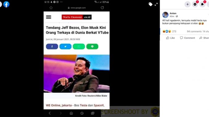 Akun Anton membagikan sebuah foto di grup Cocoklogi Science pada tanggal 10 Januari 2021 pukul 08.43 WIB. Dalam foto tersebut ditampilkan tangkapan layar berita dari Warta Ekonomi yang ditayangkan pada 8 Januari 2021 pukul 08.50 dengan judul “Tendang Jeff Bezos, Elon Musk Kini Orang Terkaya di Dunia Berkat V-Tube. Akun Anton menambahkan narasi “All hail ngademin, ternyata mobil tesla nya bukan penopang kekayaan si elon ??” di foto tersebut.