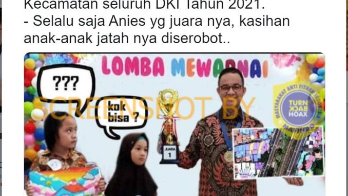 Beredar di media sosial Twitter @Thalomoan1 pada (24/01/21) , mengunggah sebuah foto Gubernur DKI Jakarta Anies Baswedan memegang piala juara mewarnai disamping dua anak kecil yang masing-masing memegang lukisannya, dengan narasi “Juara lomba mewarnai anak anak Tingkat Kecamatan seluruh DKI Tahun 2021. – Selalu saja Anies yg juara nya, kasihan anak-anak jatah nya diserobot.”. Unggahan tersebut mendapat 26 retweets, 173 likes, dan 26 komentar.