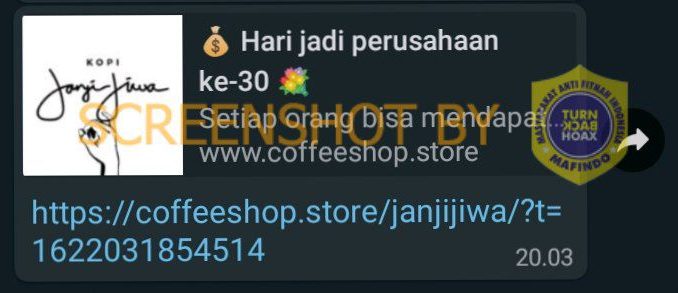 Link tersebut palsu. Faktanya, melalui akun Instagram resmi @kopijanjijiwa dalam salah satu postingannya menginformasikan hal tersebut adalah hoaks. Kopi Janji Jiwa juga menjelaskan segala bentuk kegiatan (Event, Giveaway, Kuis, dll) hanya diselenggarakan di akun Instagram resmi.