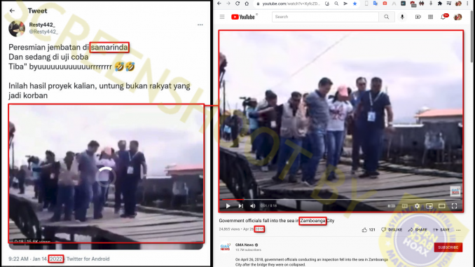 Salah satu sumber video yang identik, GMA News pada 26 April 2018: “On April 26, 2018, government officials conducting an inspection fell into the sea in Zamboanga City after the bridge they were on collapsed.”